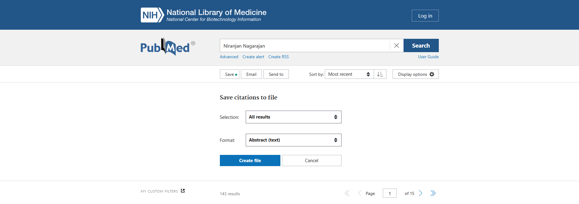 The publications are fetched from PubMed. Search the name (Niranjan Nagarajan) and save the results to a summary file by clicking the